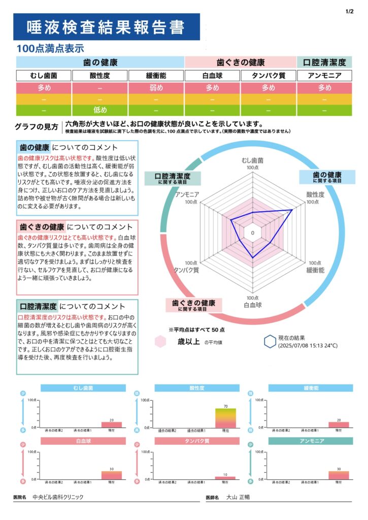 唾液検査によって虫歯や歯周病のリスク、お口の健康度がその場で瞬時にわかります。結果に応じて必要な治療やメンテナンスのご提案が可能です。